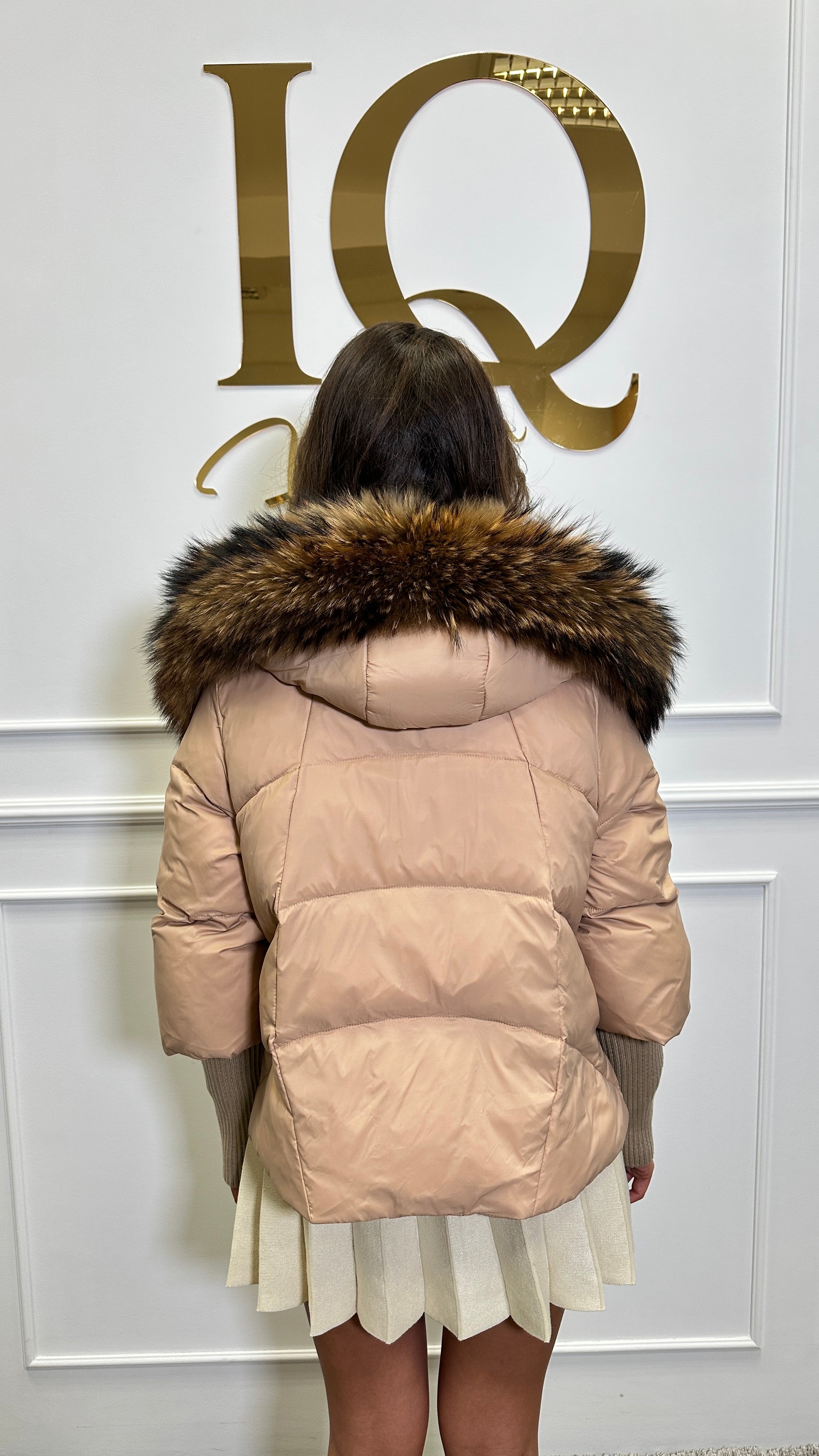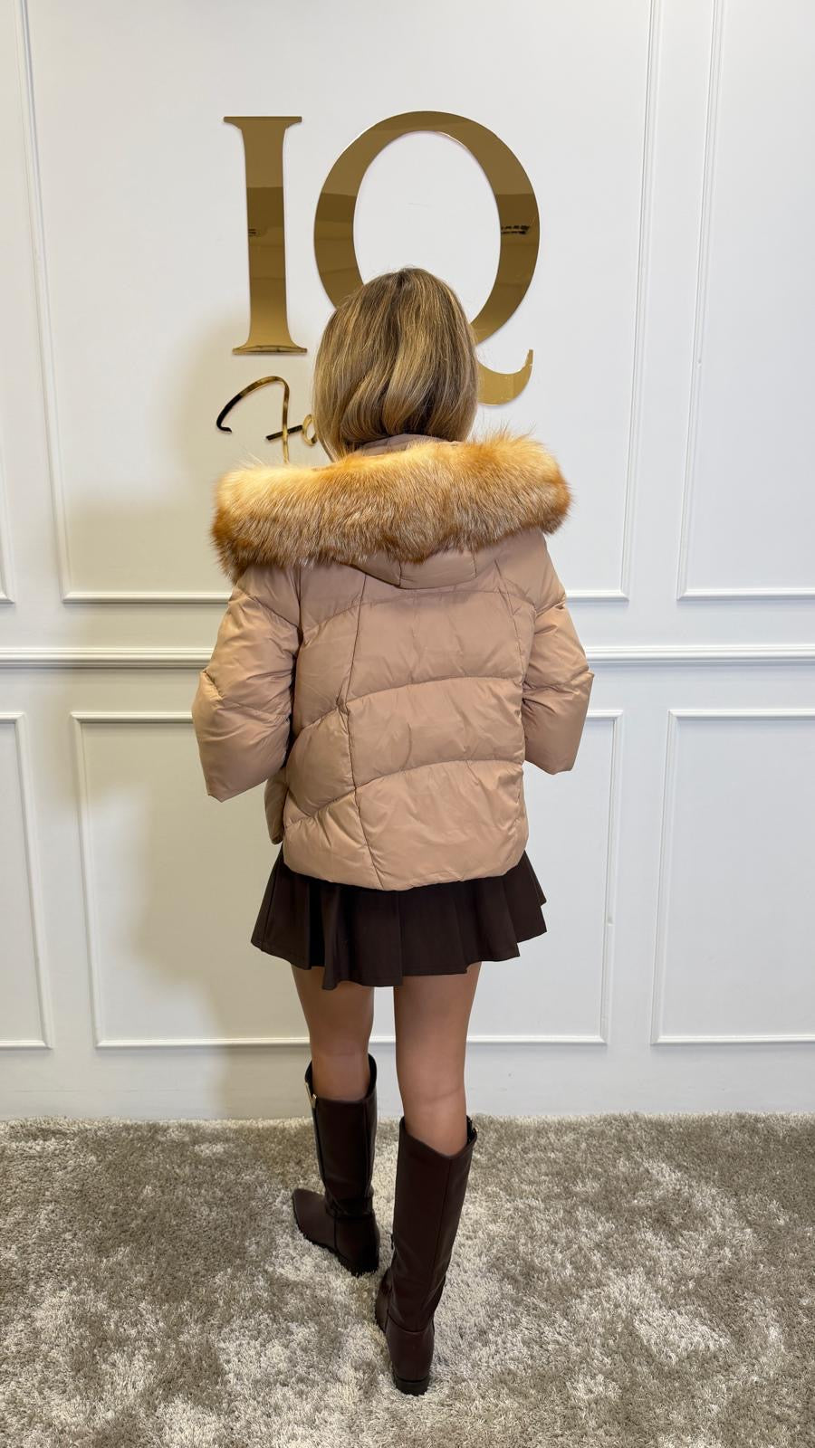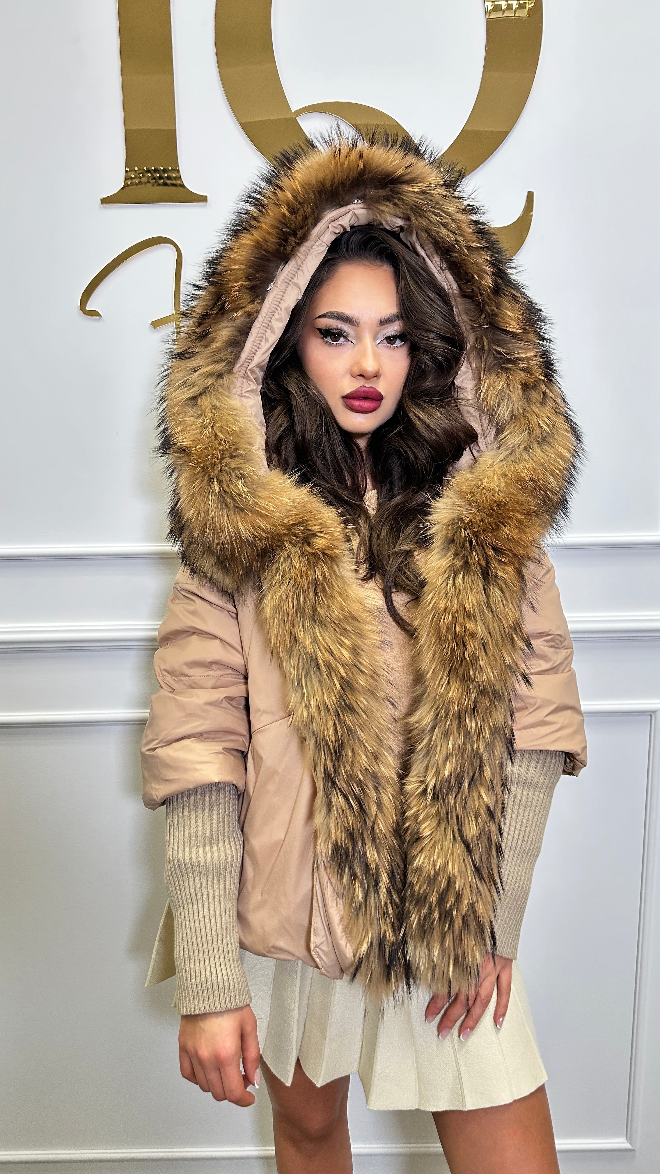 Haina fas matlasata ,eleganta si calduroasa, supradimensionata , croi larg. Interiorul este din puf natural iar blana din vulpe arctica detasbila
