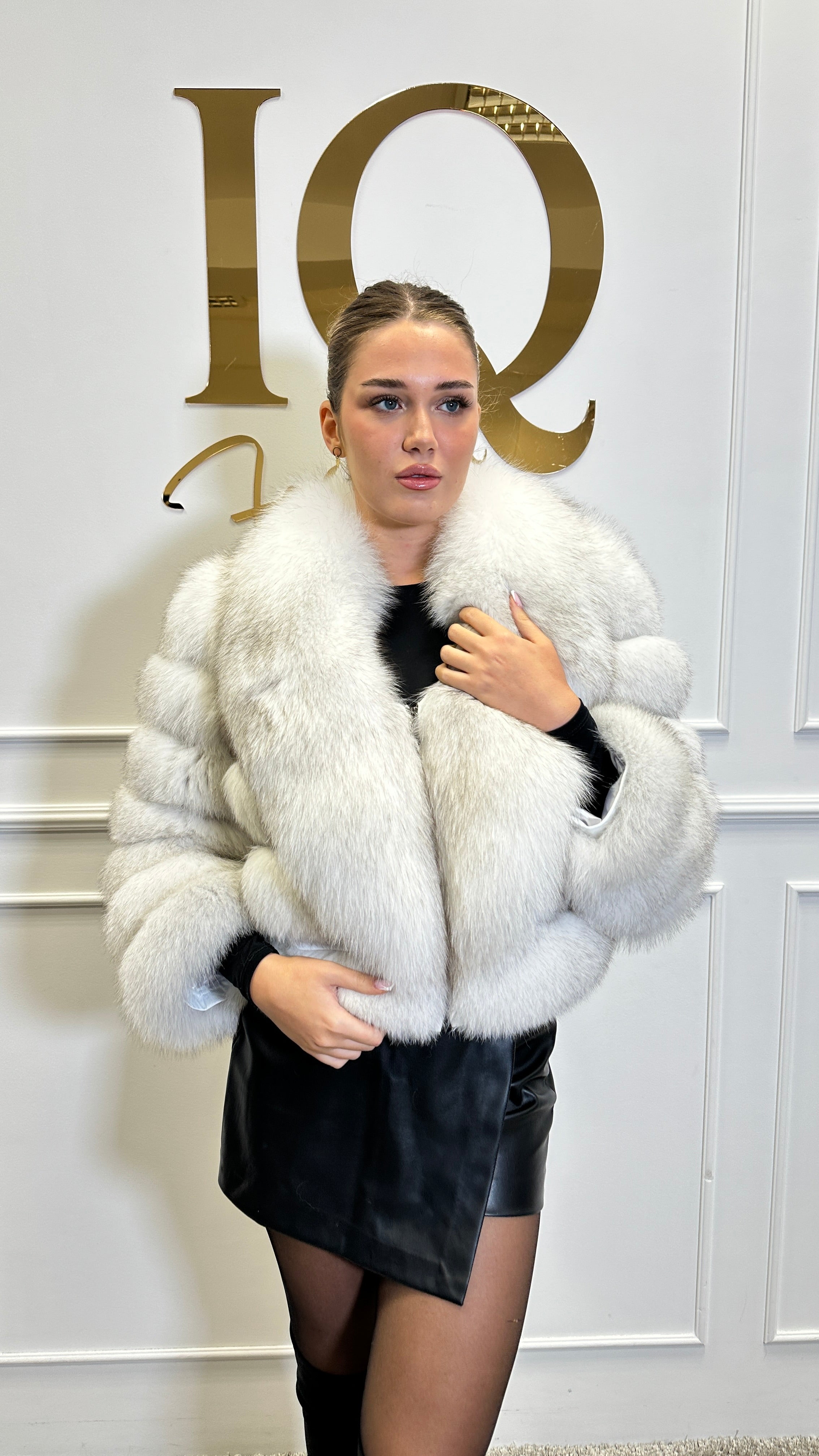 Haina luxoasa din blana naturala de vulpe arctica cu maneci detasbile in dreptul umarului ,model 2/1 care poate fi purtata si ca vesta. Haina are un guler luxuriant din blana de vulpe care ii da un aspect cu adevarat luxos.