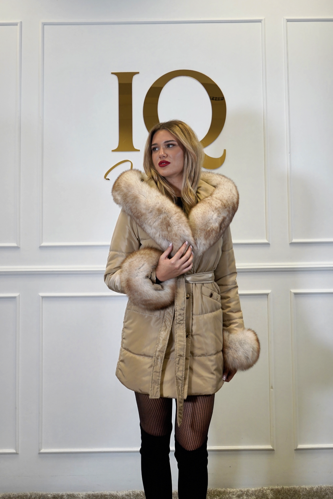 Haina din fas matlasata, eleganta si calduroasa, accesorizata cu blana naturala de vulpe canadiana aurie,detasabila. Model usor supradimensionat, se potriveste si cu o masura mai mare. Unele masuri se pot produce in 7-8 zile lucratoare