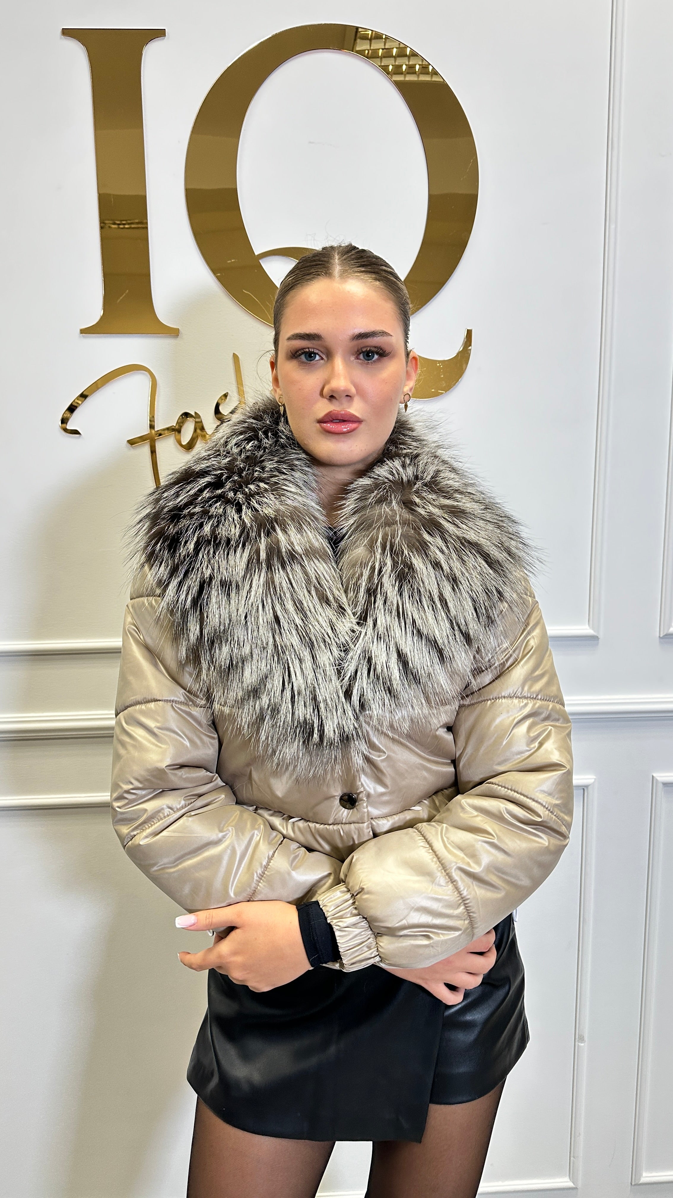 Haina din fas matlasata, eleganta si calduroasa,accesorizata cu blana naturala canadiana aurie,detasabila.model larg ,secpotriveste si cu o masura msi mare