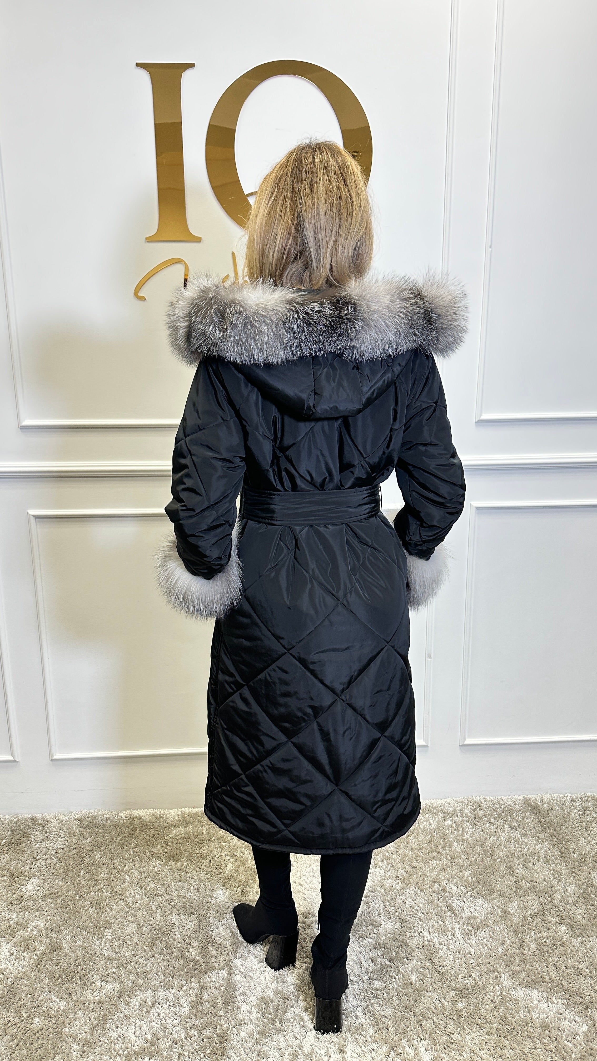 Haina din fas matlasata, eleganta si calduroasa, cu blana naturala de vulpe argintie .Manechina are 50 de kg si poarta masura XS.Anumite masuri se aduc pe baza de comanda in 7 zile lucratoare