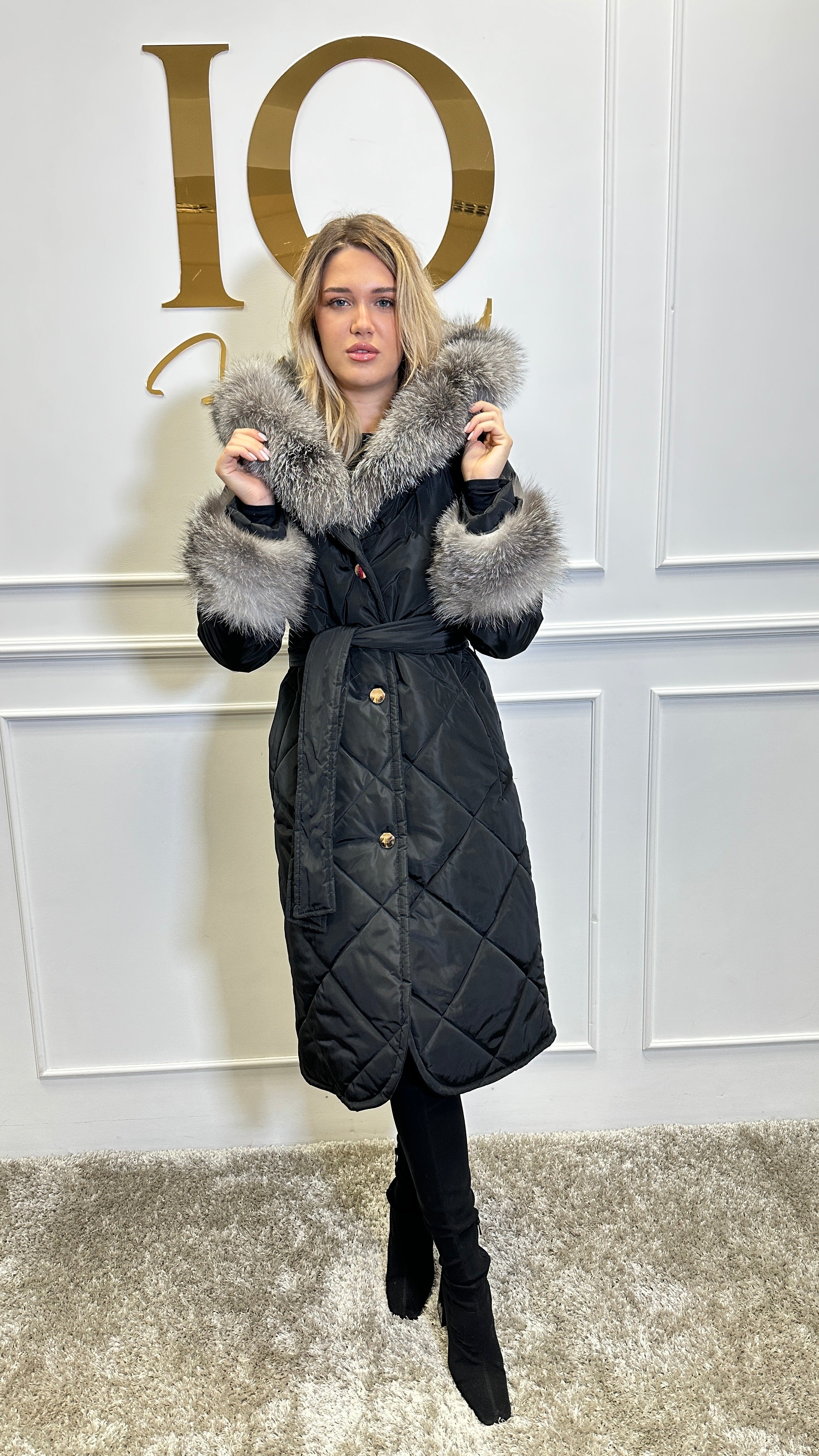 Haina din fas matlasata, eleganta si calduroasa, cu blana naturala canadiana argintie ,t Model mai larg usir supradimensionat secpotrivestecsi cu o madura mai mare