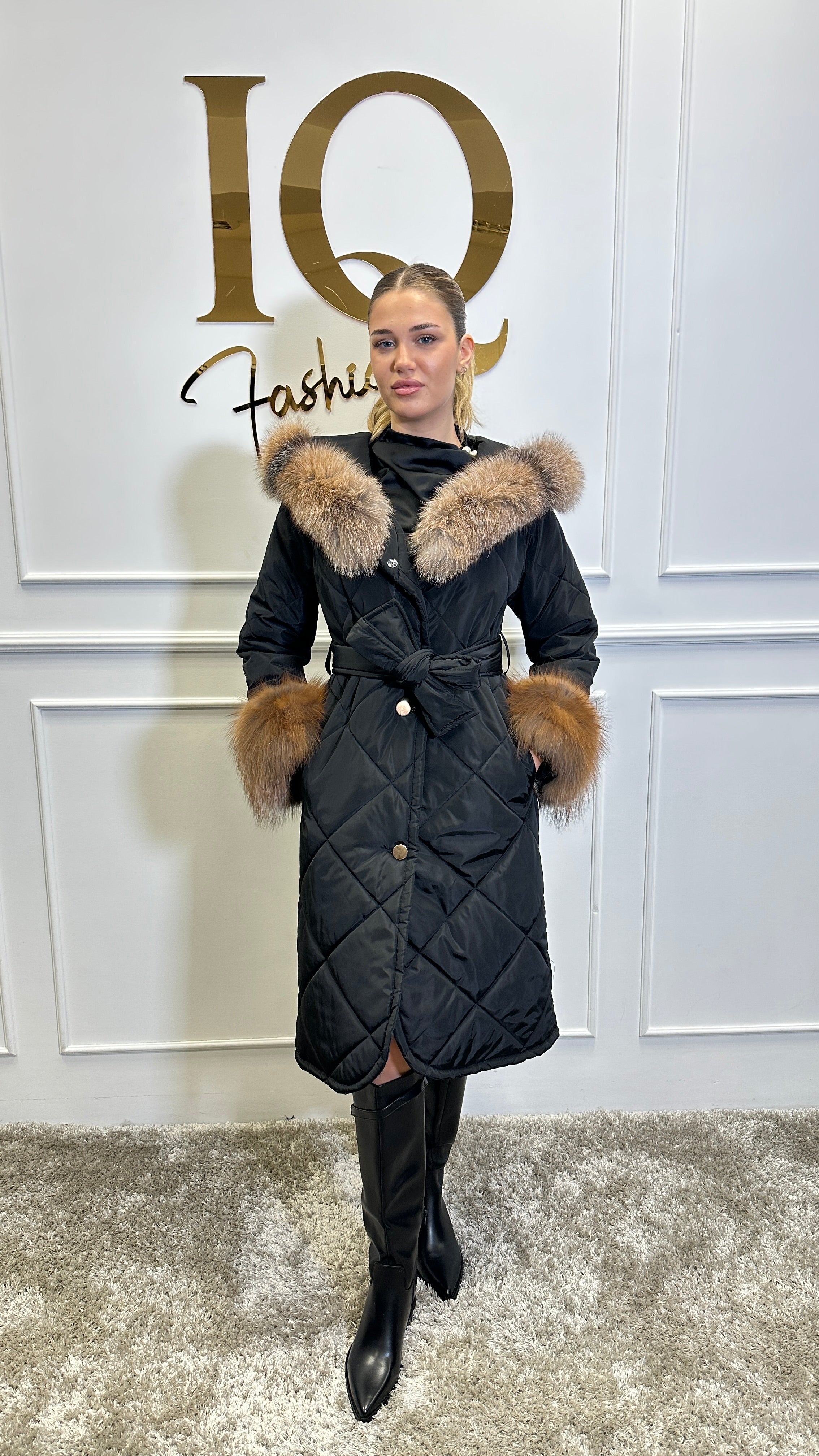 Haina din fas matlasata, eleganta si calduroasa, cu blana naturala canadiana aurie detasabila.Croi larg,mai supradimensionat