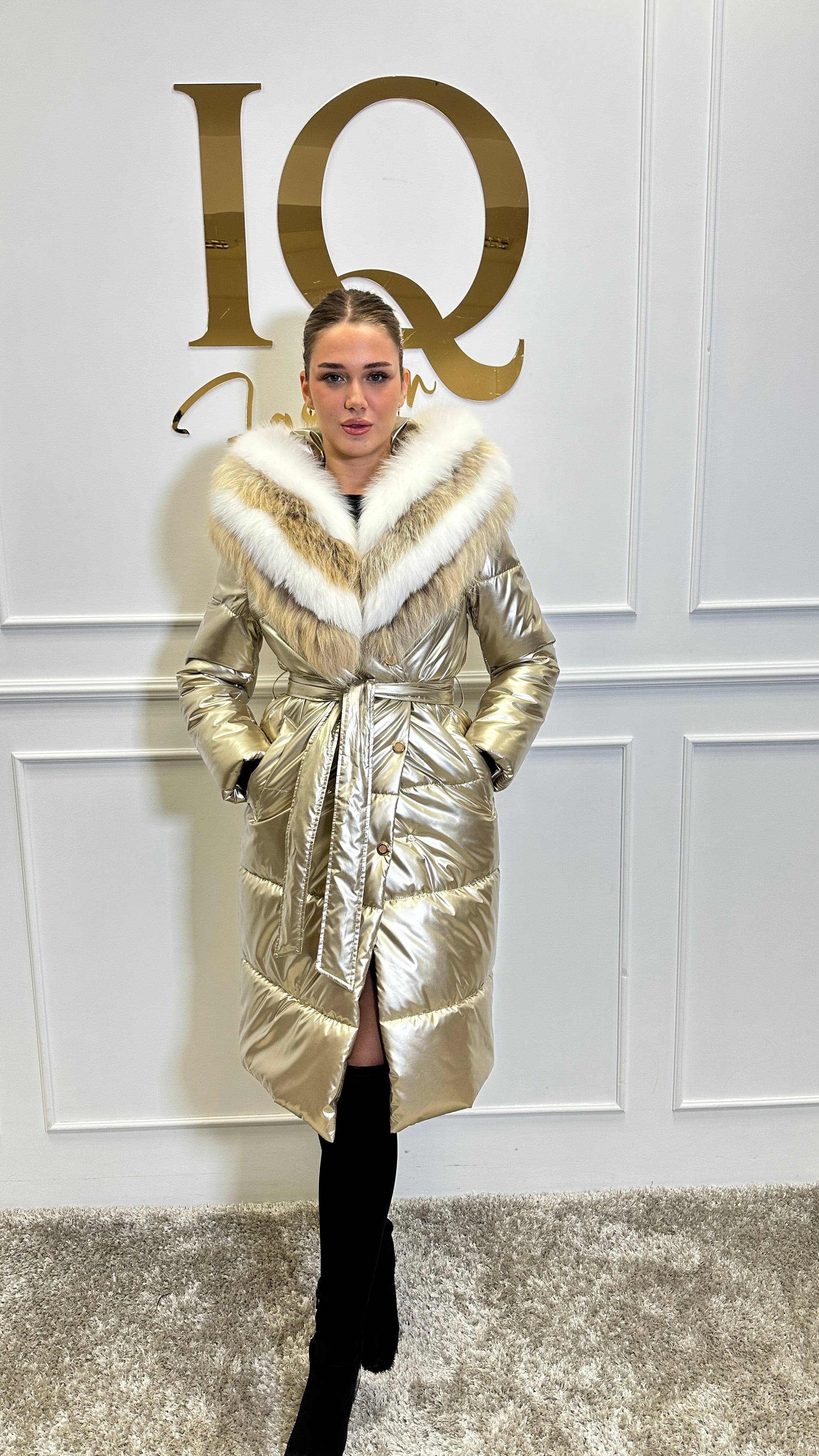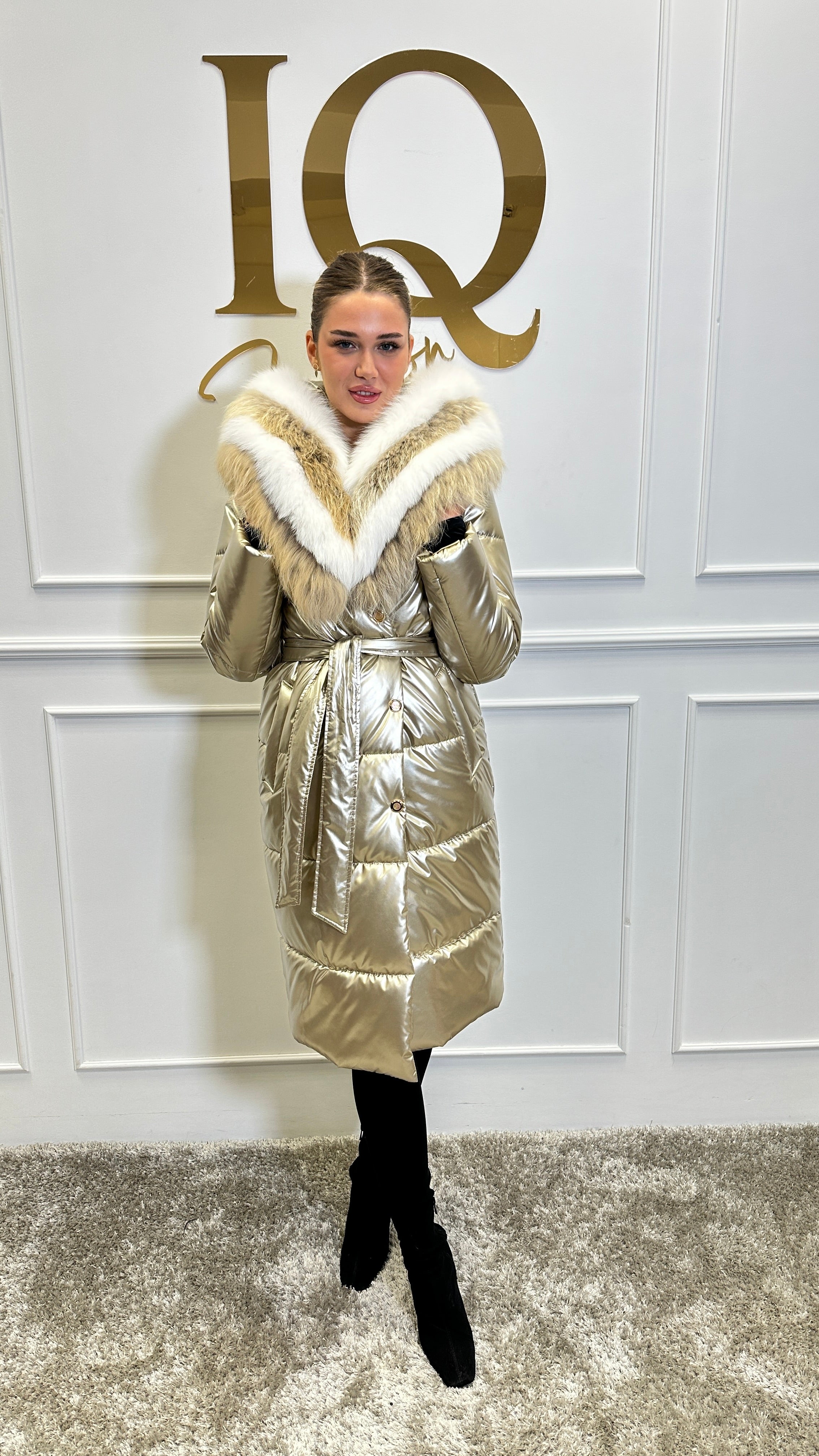 Haina din fas matlasata, eleganta si calduroasa,accesorizata cu blana naturala canadiana aurie,detasabila.model larg ,secpotriveste si cu o masura msi mare