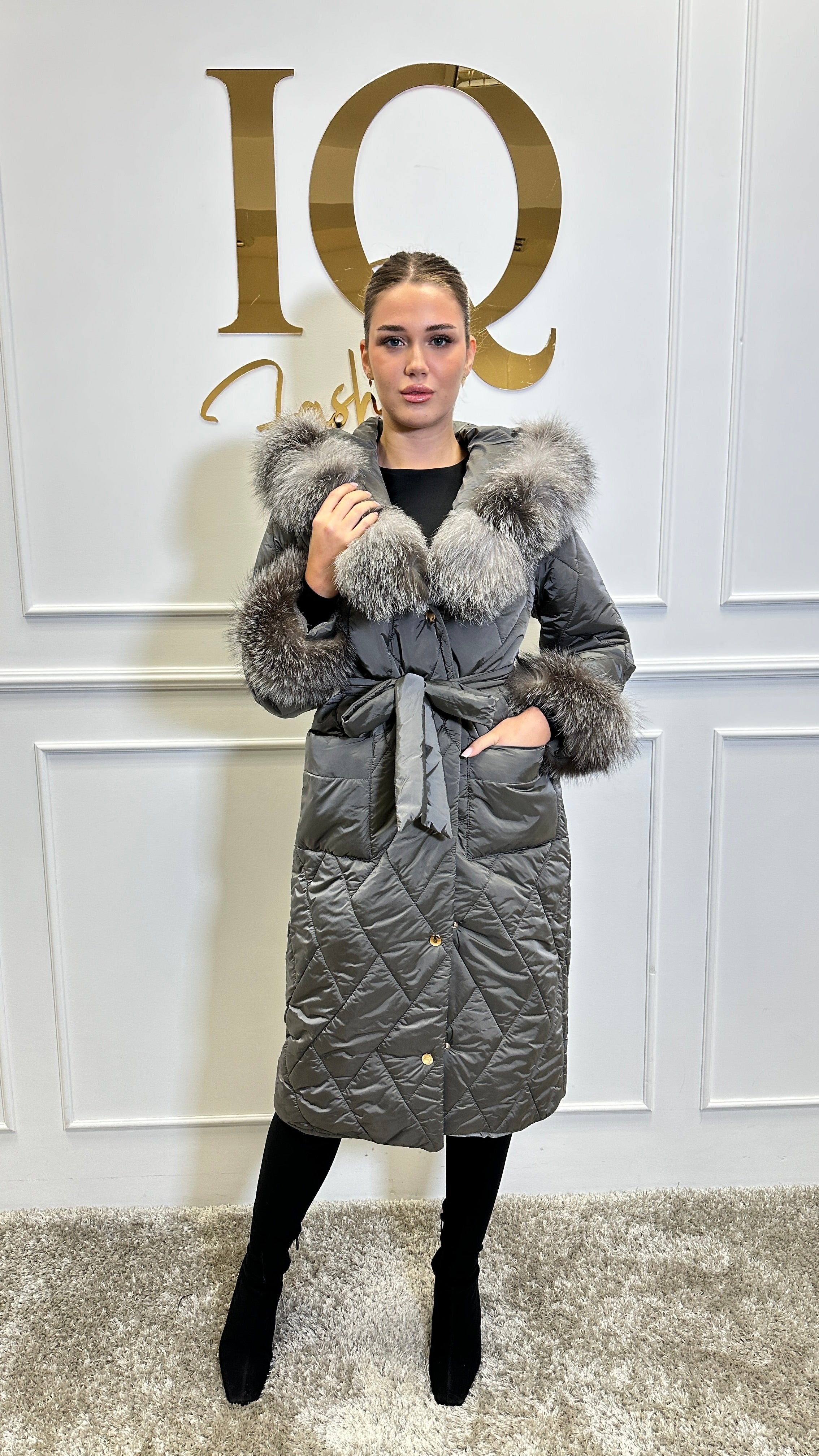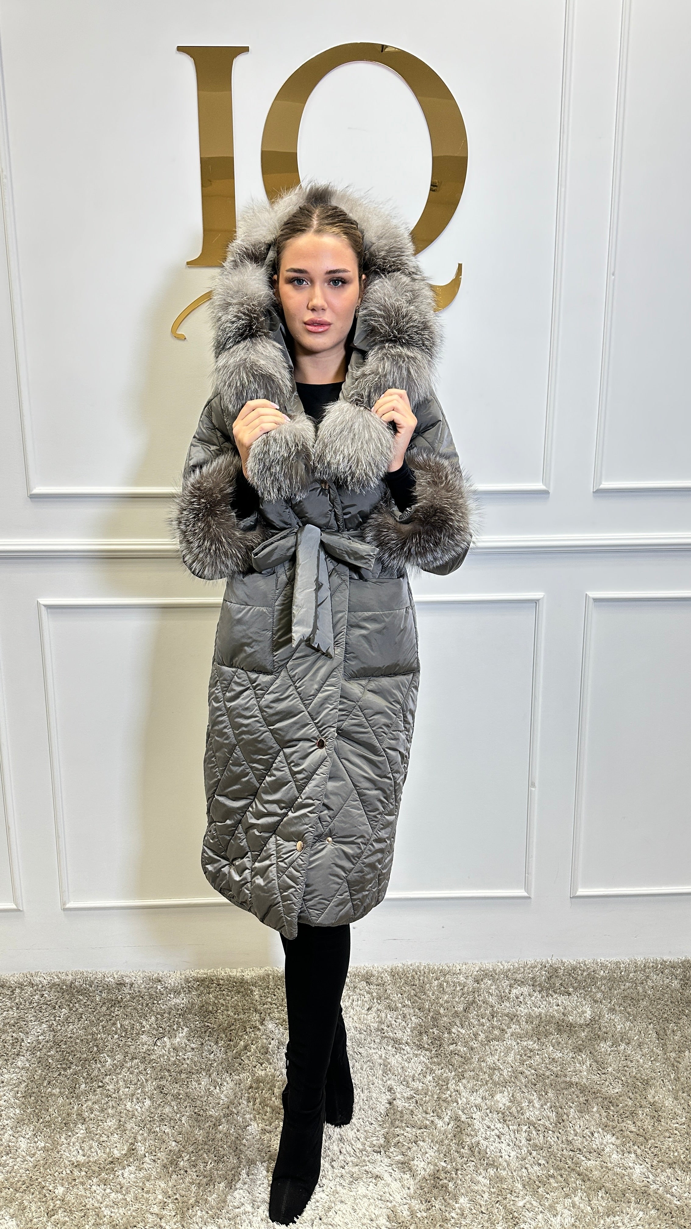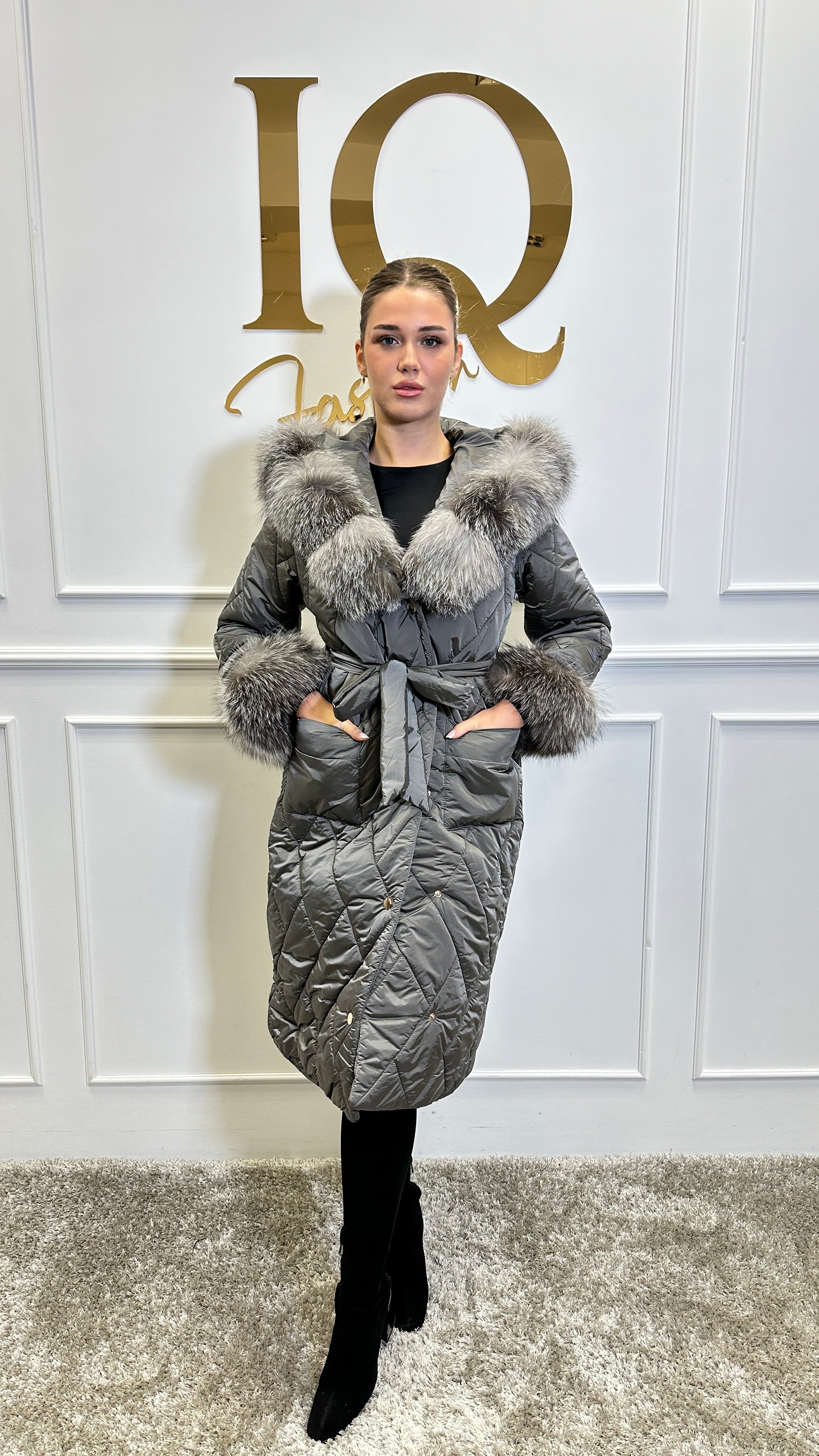 Haina din fas matlasata, eleganta si calduroasa, cu blana naturala canadiana argintie ,t Model mai larg usir supradimensionat, se potriveste cu o madura mai mare.
