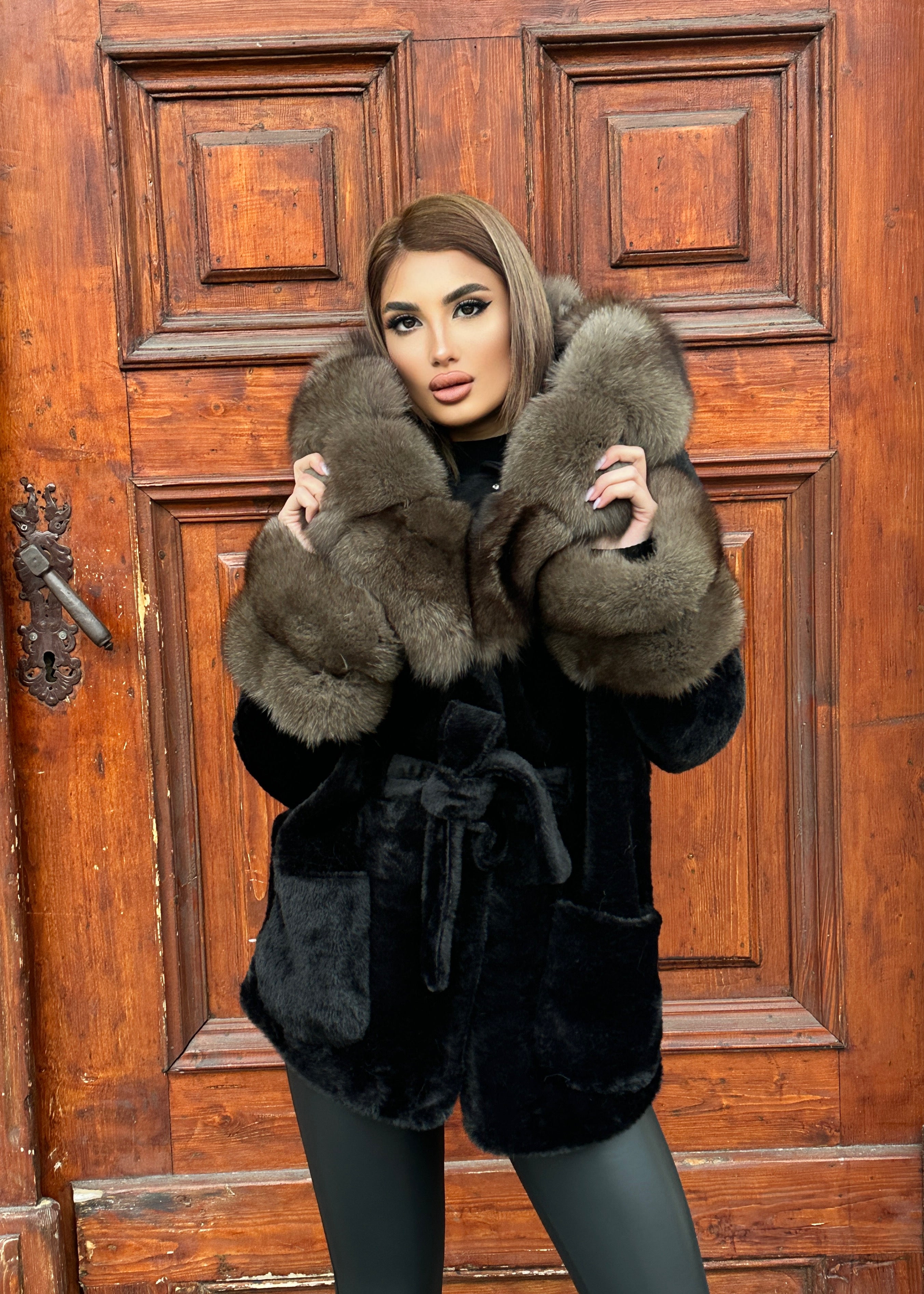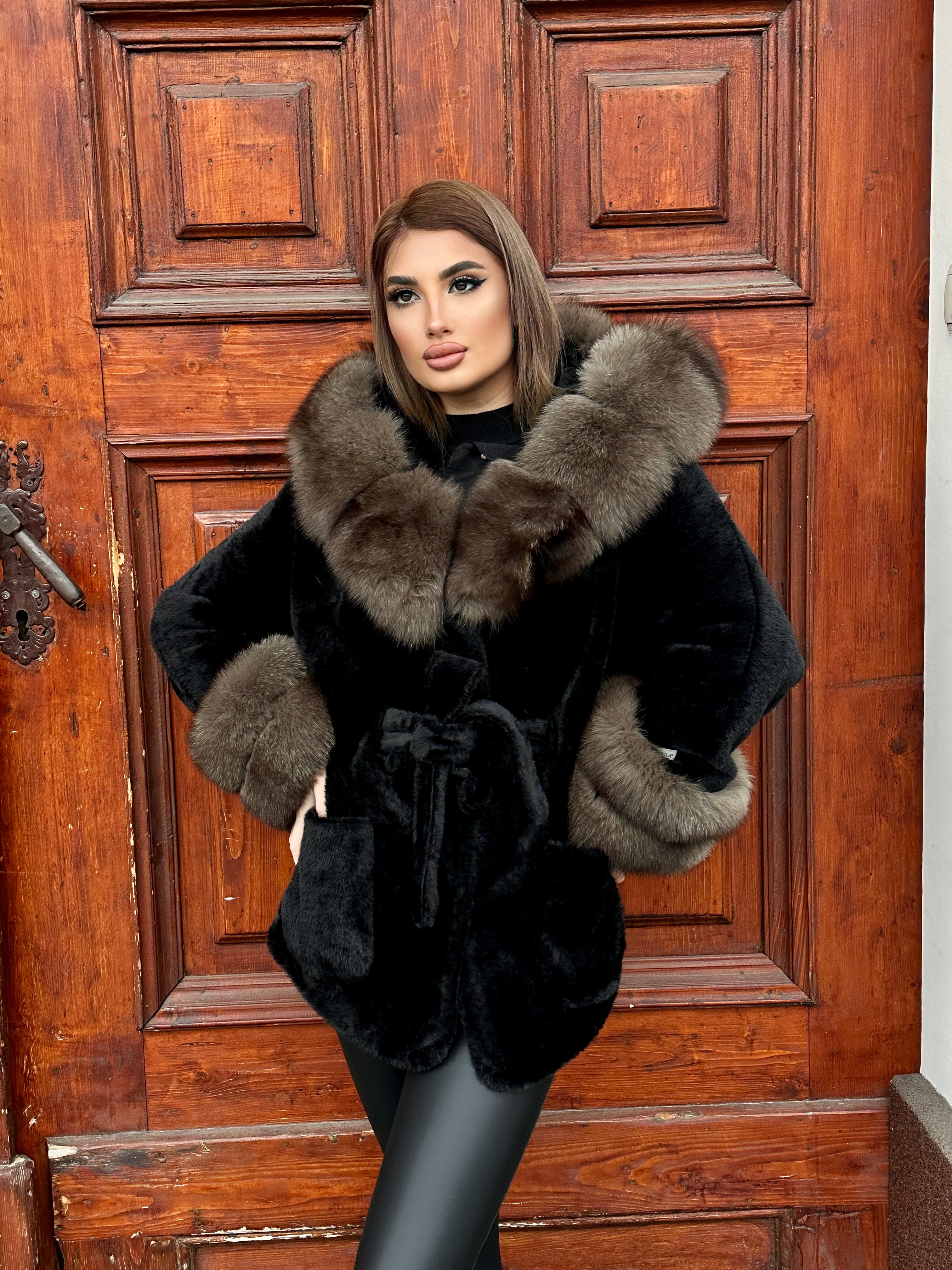 Produs este din lana de alcantara (baby lama)si accesorizat cu blana naturala. Se poate executa pe multe variante de culoare si pe alte masuri in 7-8 zile lucratoare.manechina are 55 kg si poarta masura S.Comanda la anumite masuri poate dura 7-8 zile lucratoare