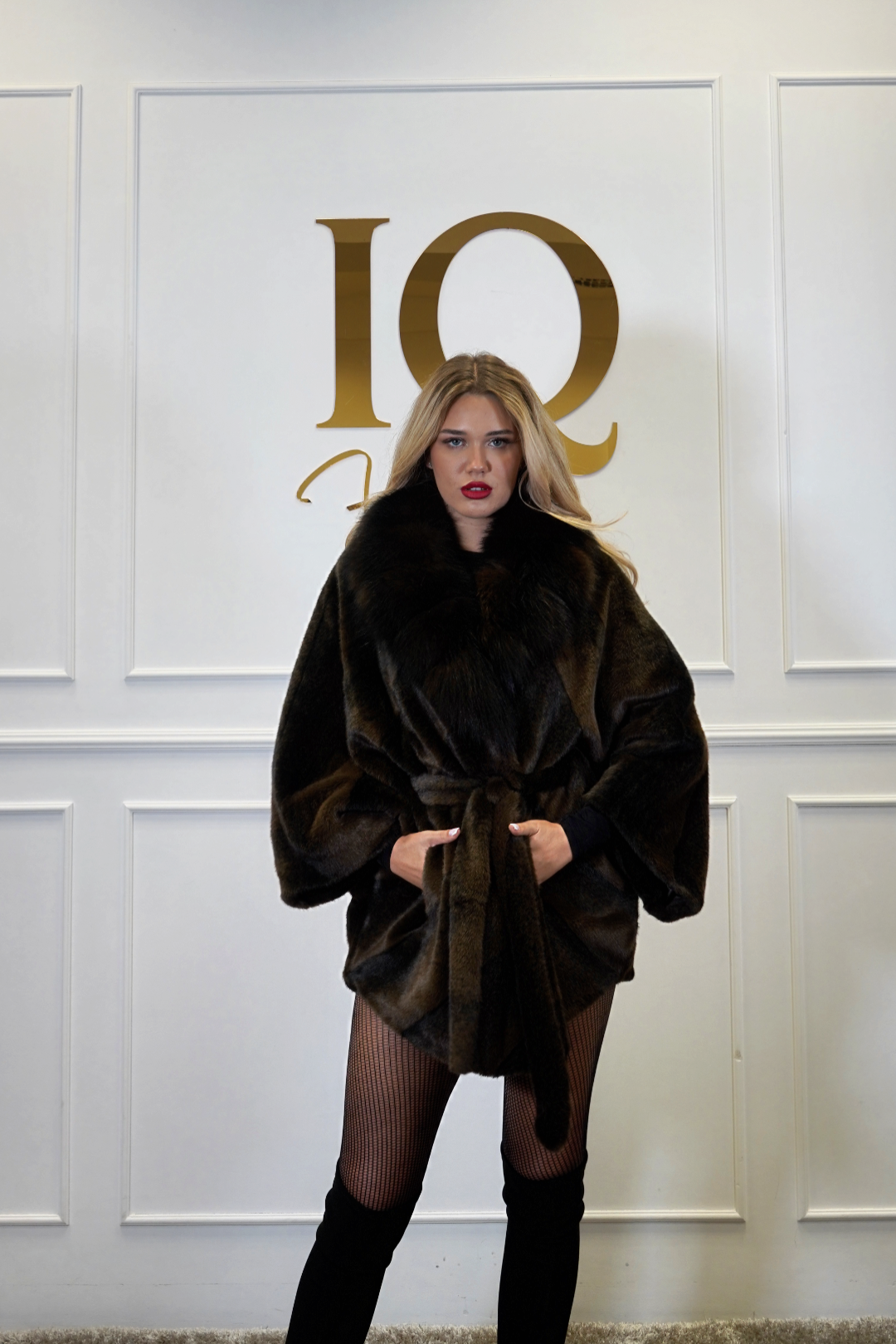 Haina din fas matlasata, eleganta si calduroasa,accesorizata cu blana naturala canadiana aurie,detasabila.model larg ,secpotriveste si cu o masura msi mare