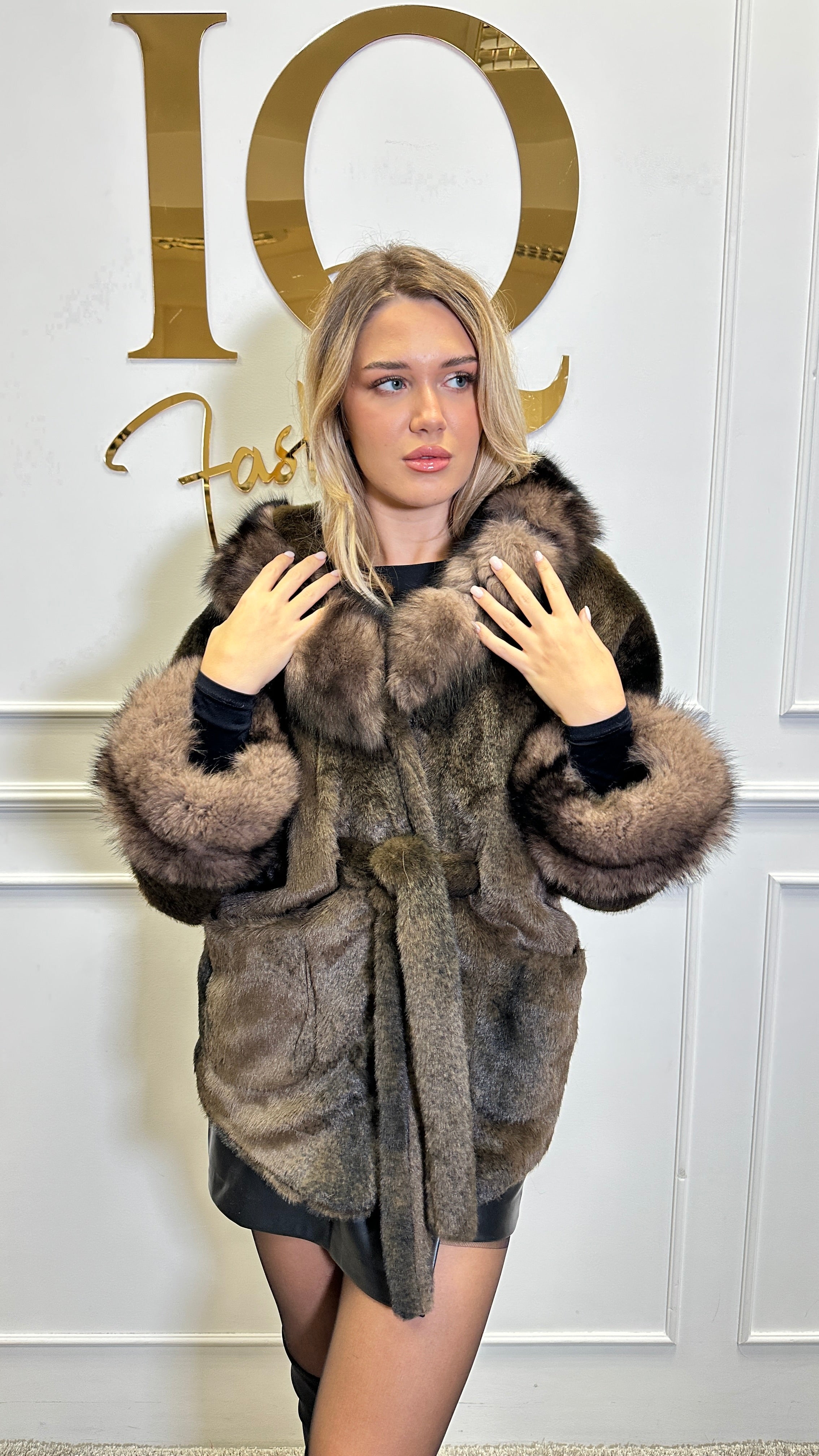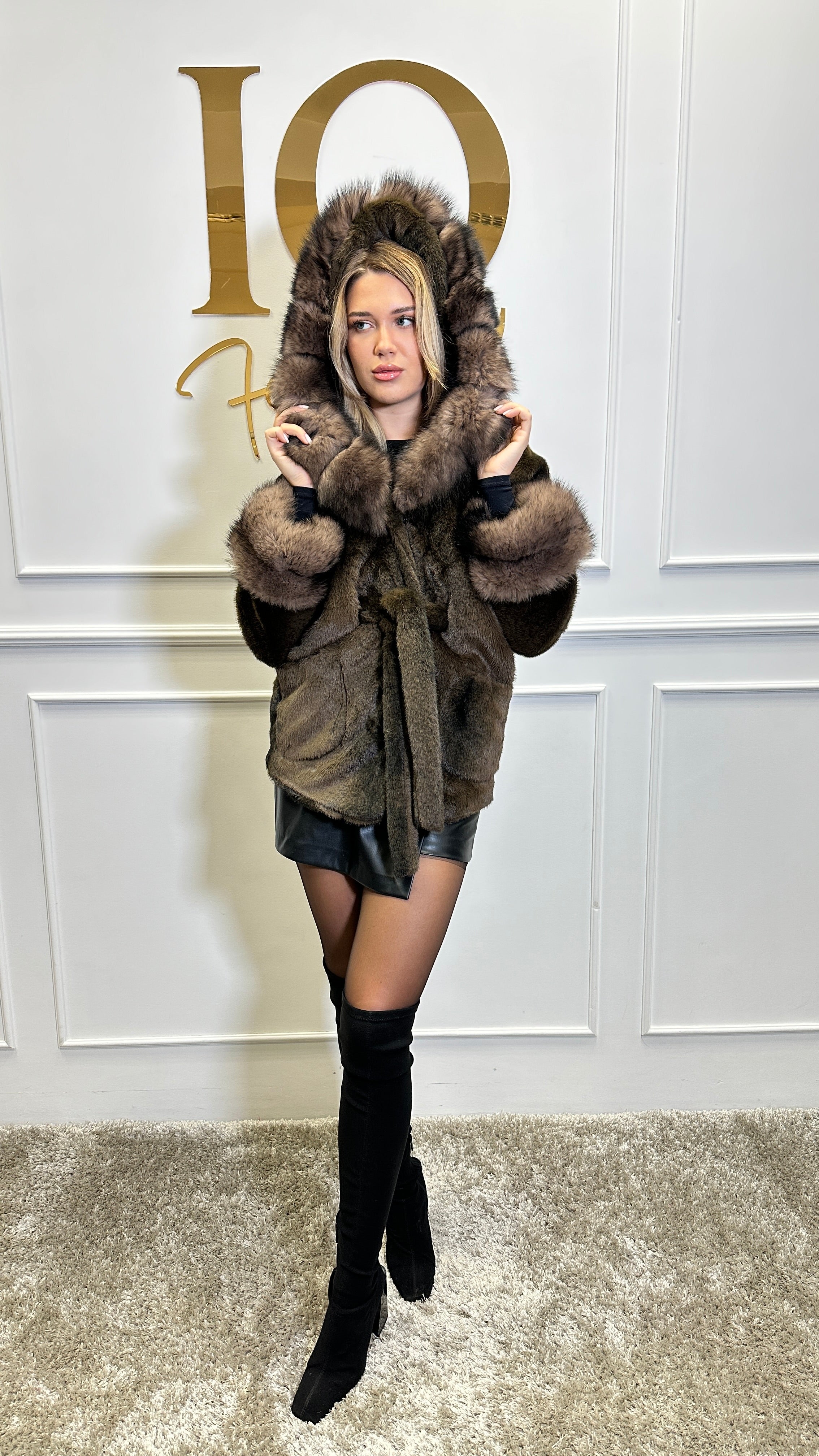 Produs este din lana de alcantara (baby lama)si accesorizat cu blana naturala de vulpe arctica.Model usor supradimensionat, captusita cu matase.Unele masuri pot sa dureze pana la 7 zile lucratoare