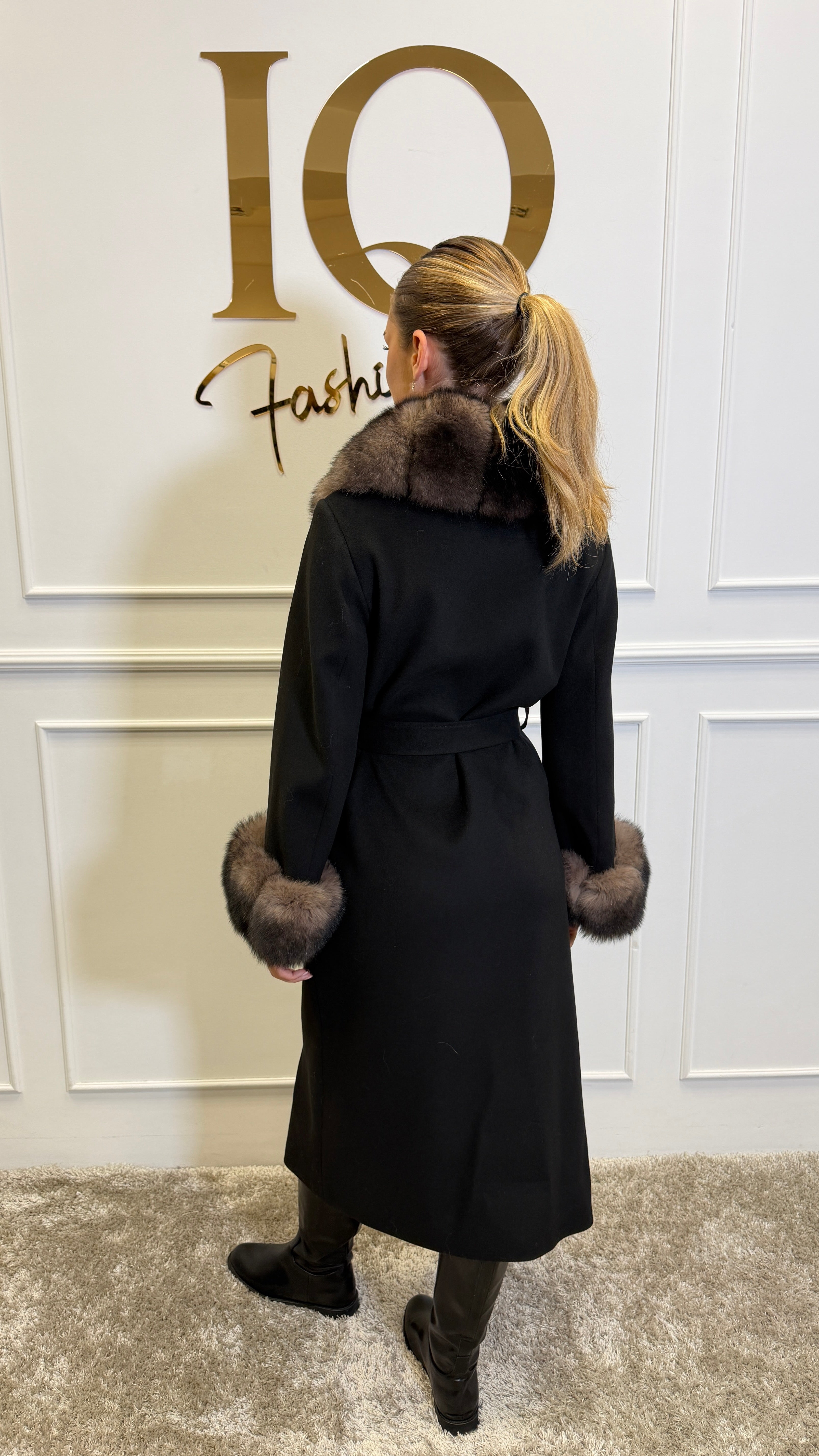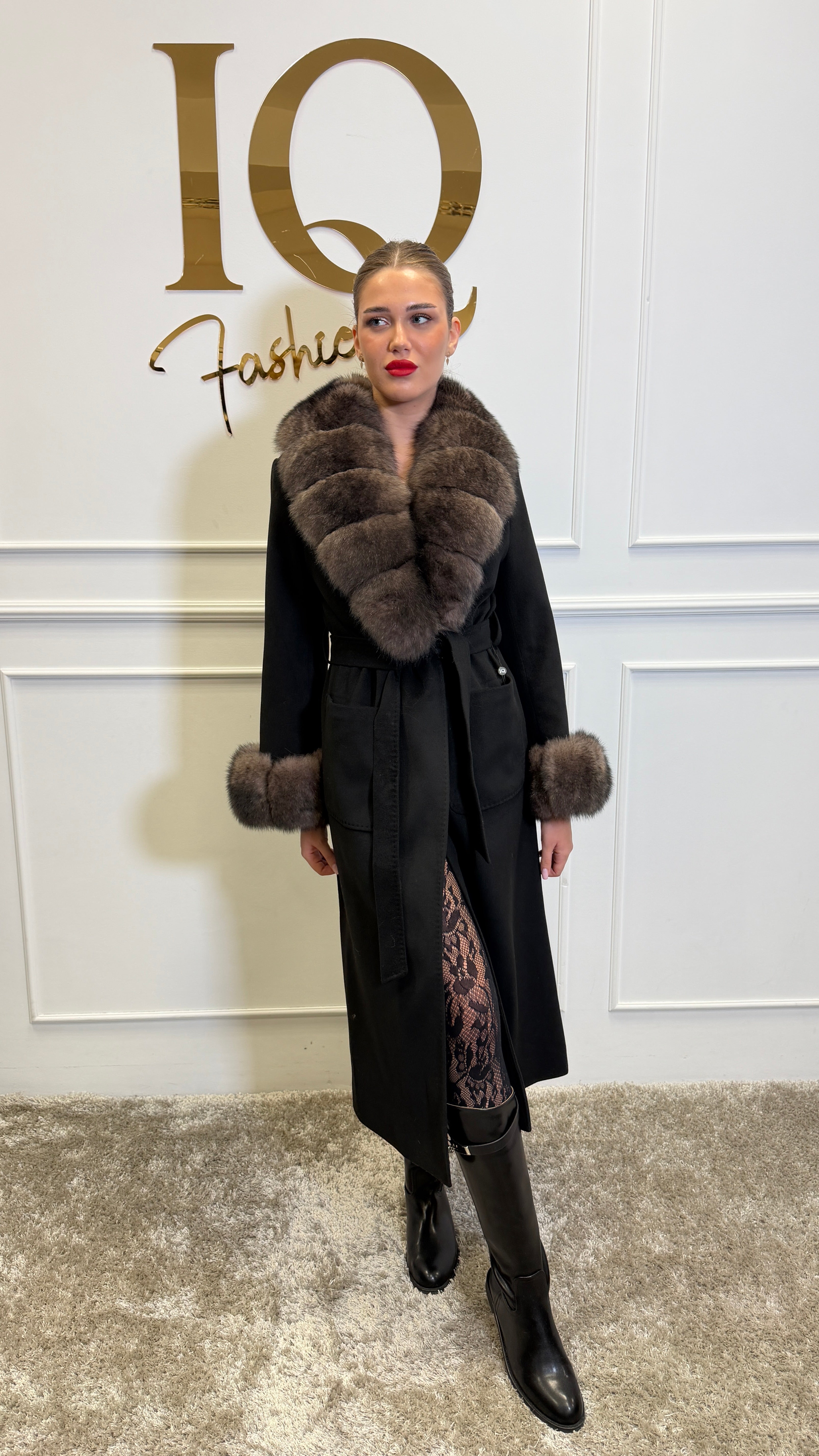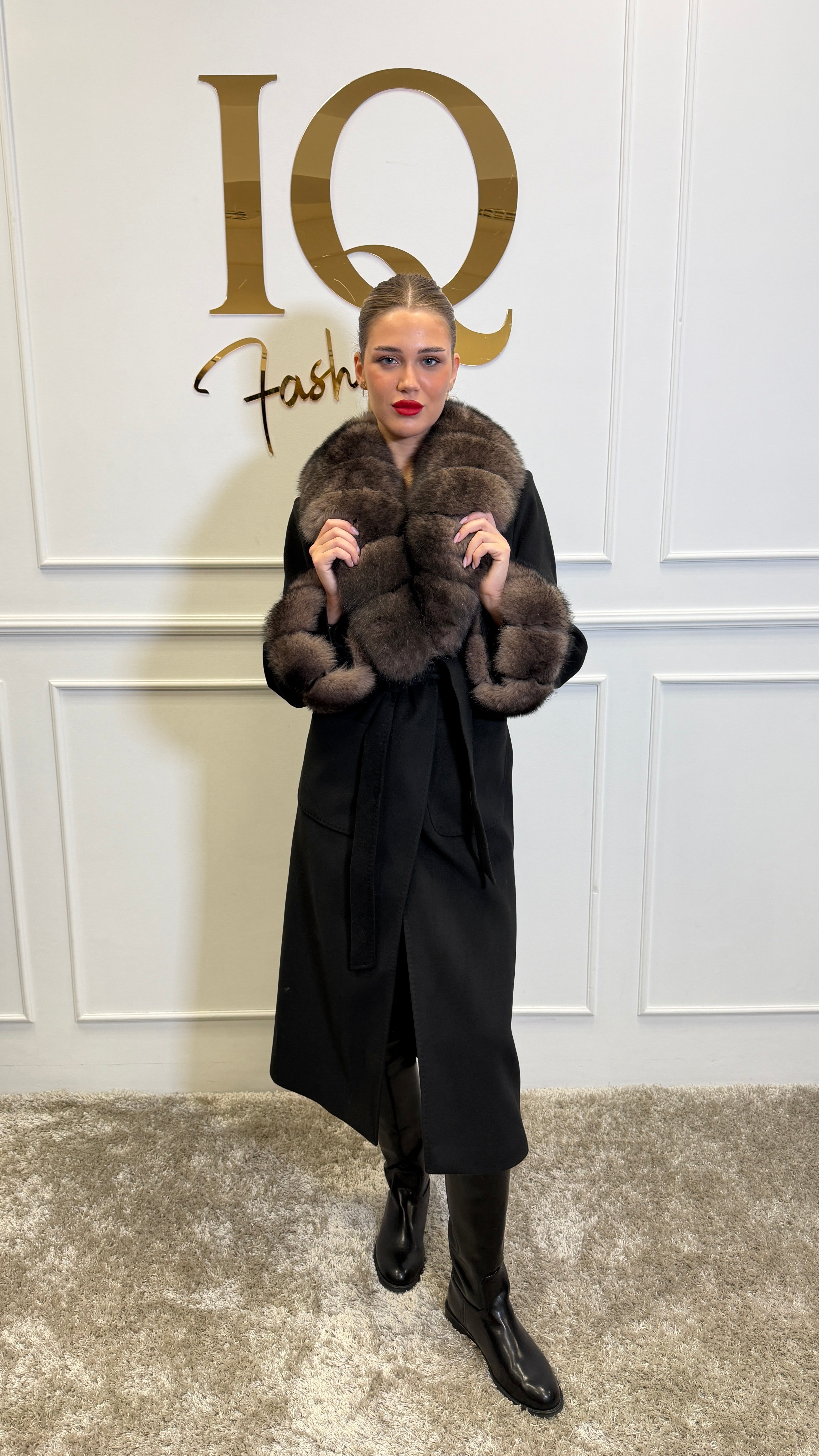 Haina este din testura de lana tip soft cashmir, captusita cu matase si accesorizata cu blana luxoasa de vulpe arctica, care este detasabila.