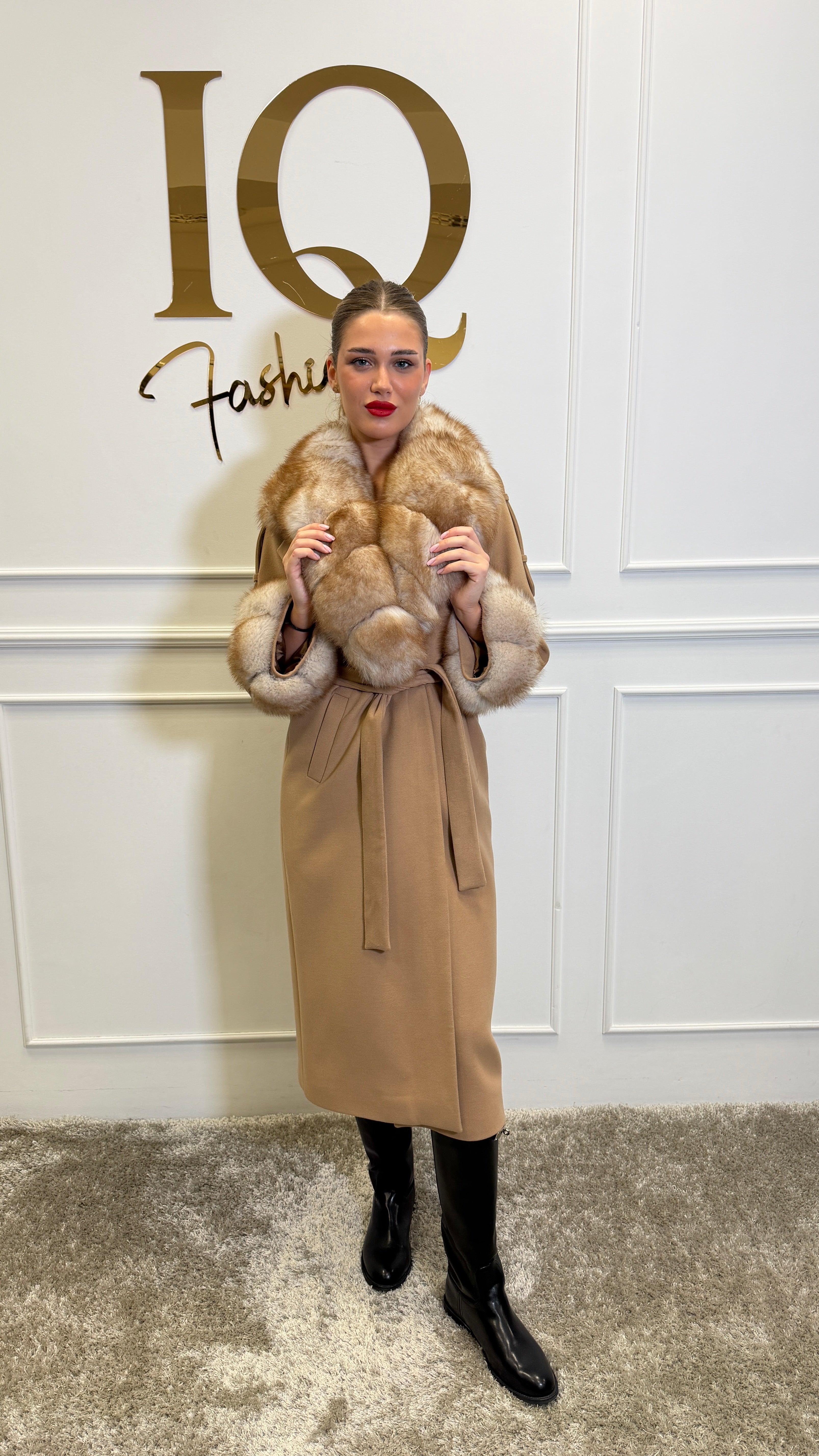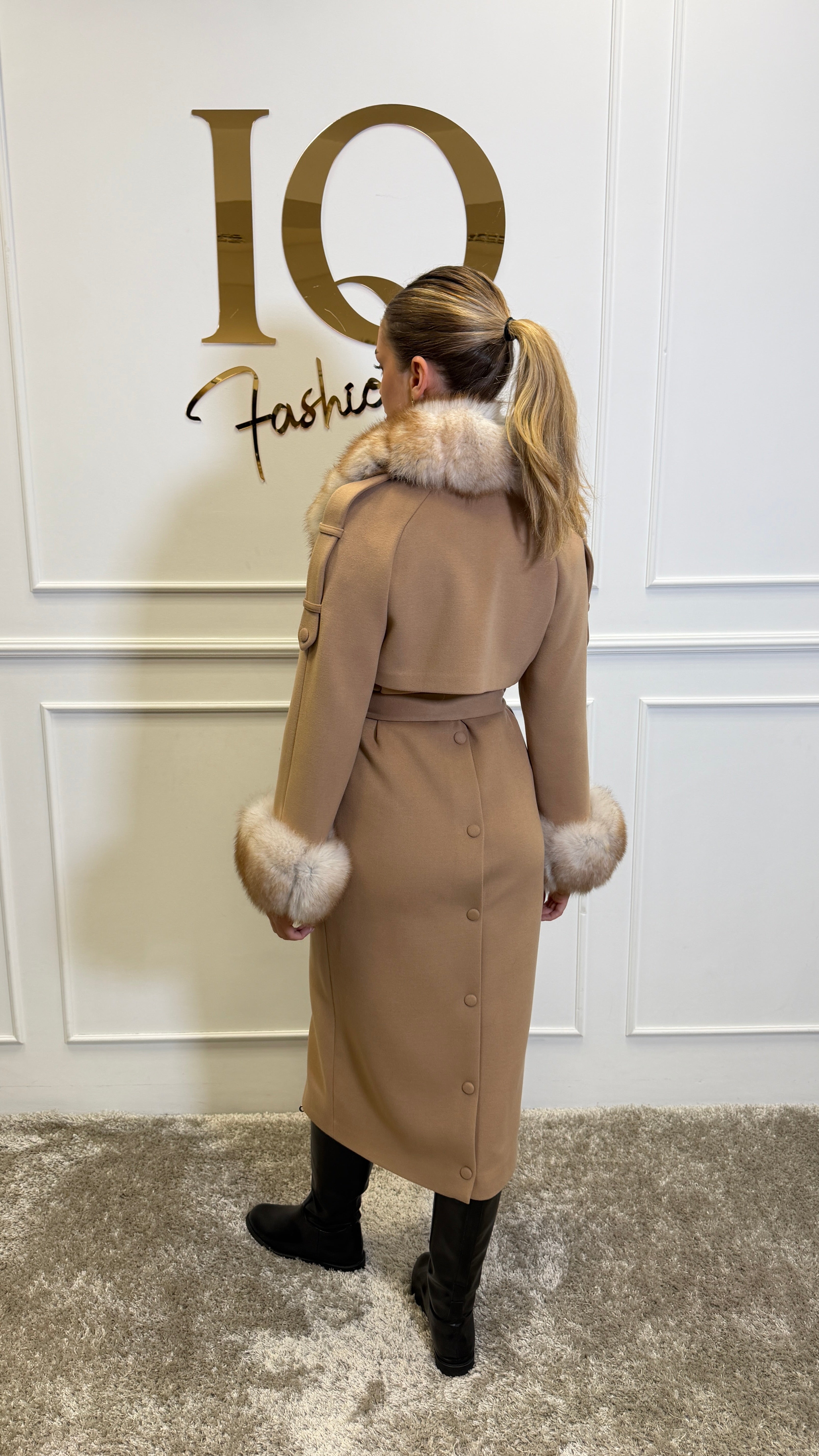 Haina este din testura de lana tip soft cashmir, captusita cu matase si accesorizata cu blana luxoasa de vulpe arctica, care este detasabila.