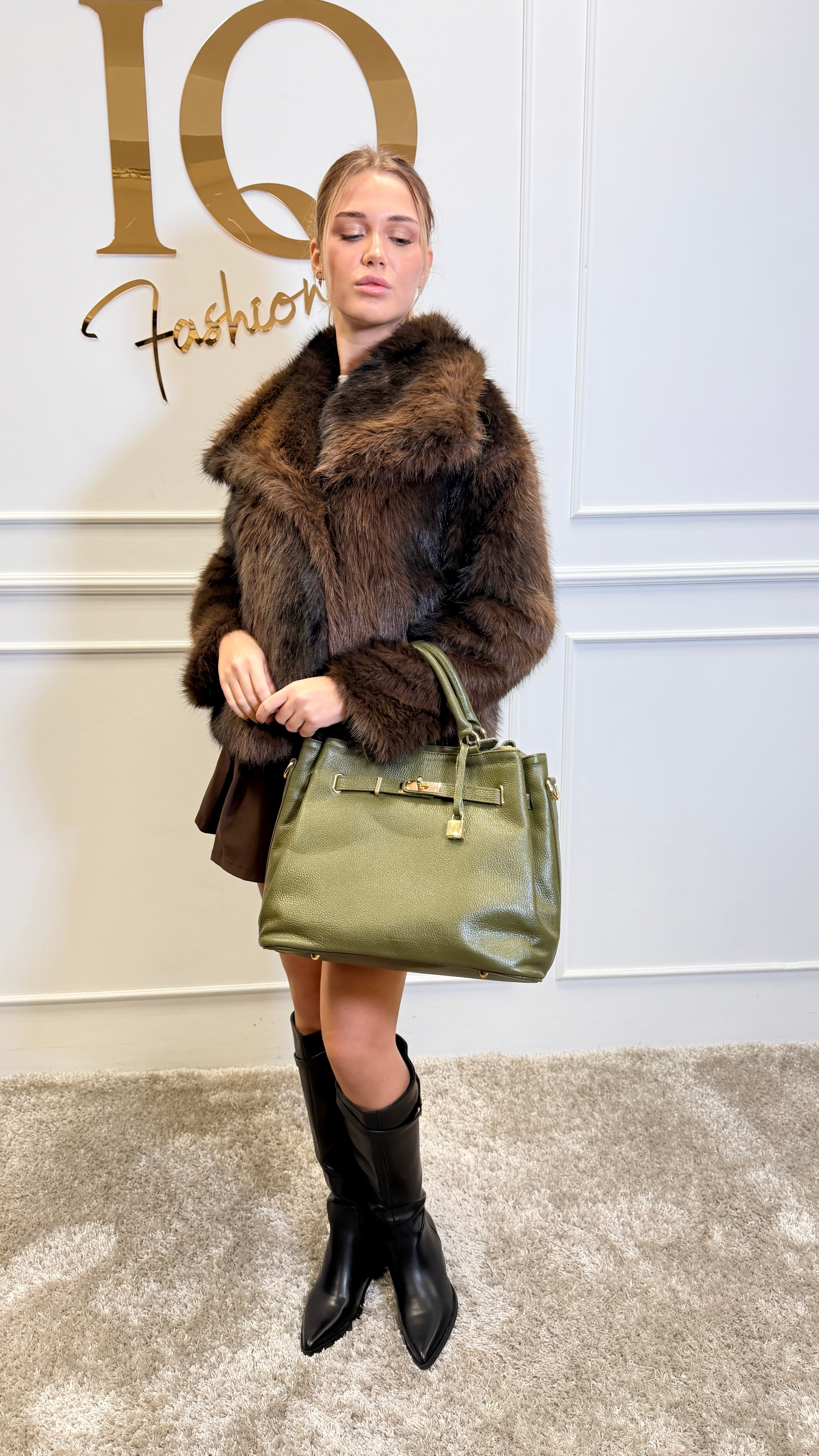 Poseta din piele naturala cu inchidere capac, contine si toarta pentru umar si mana.